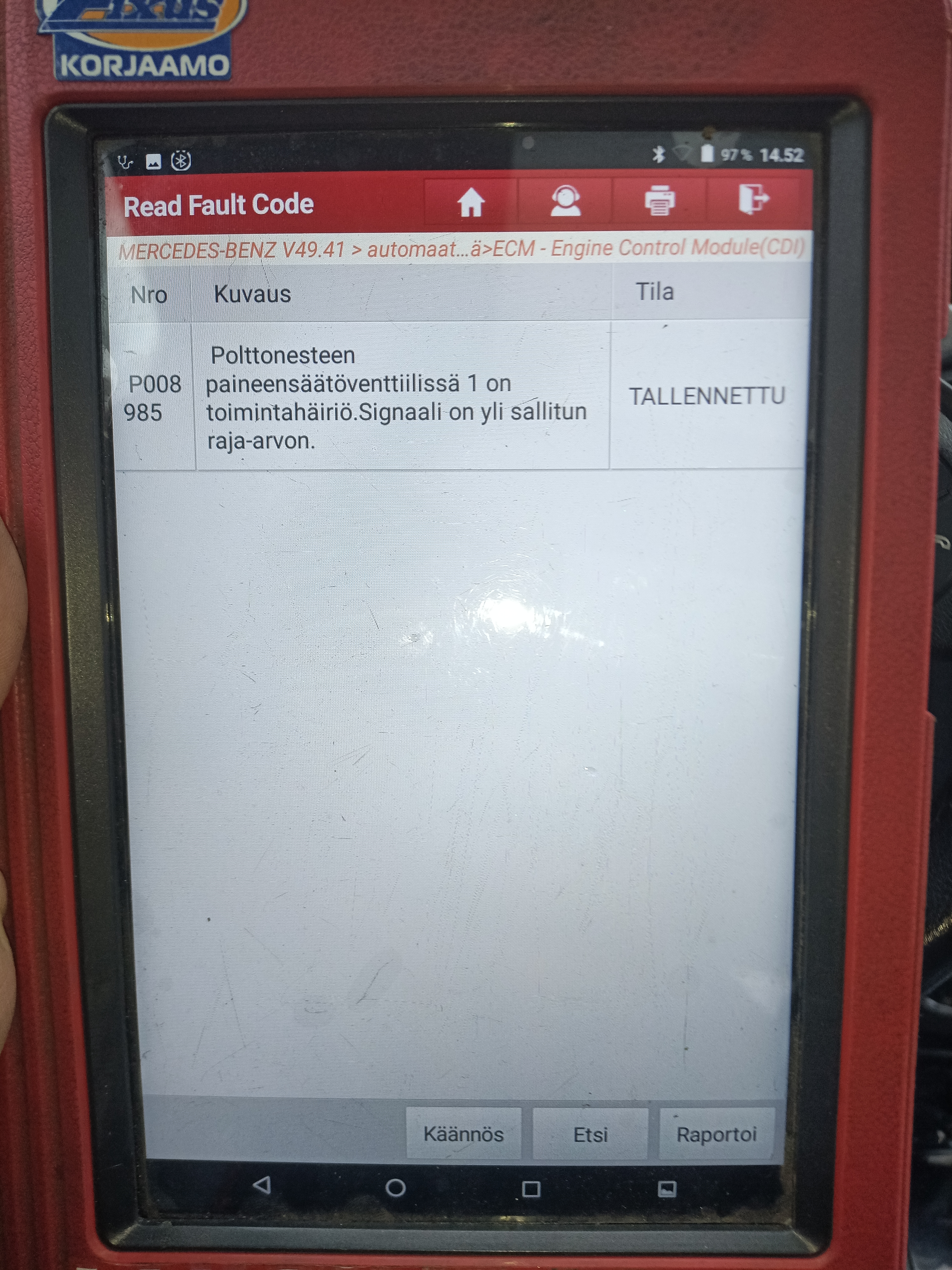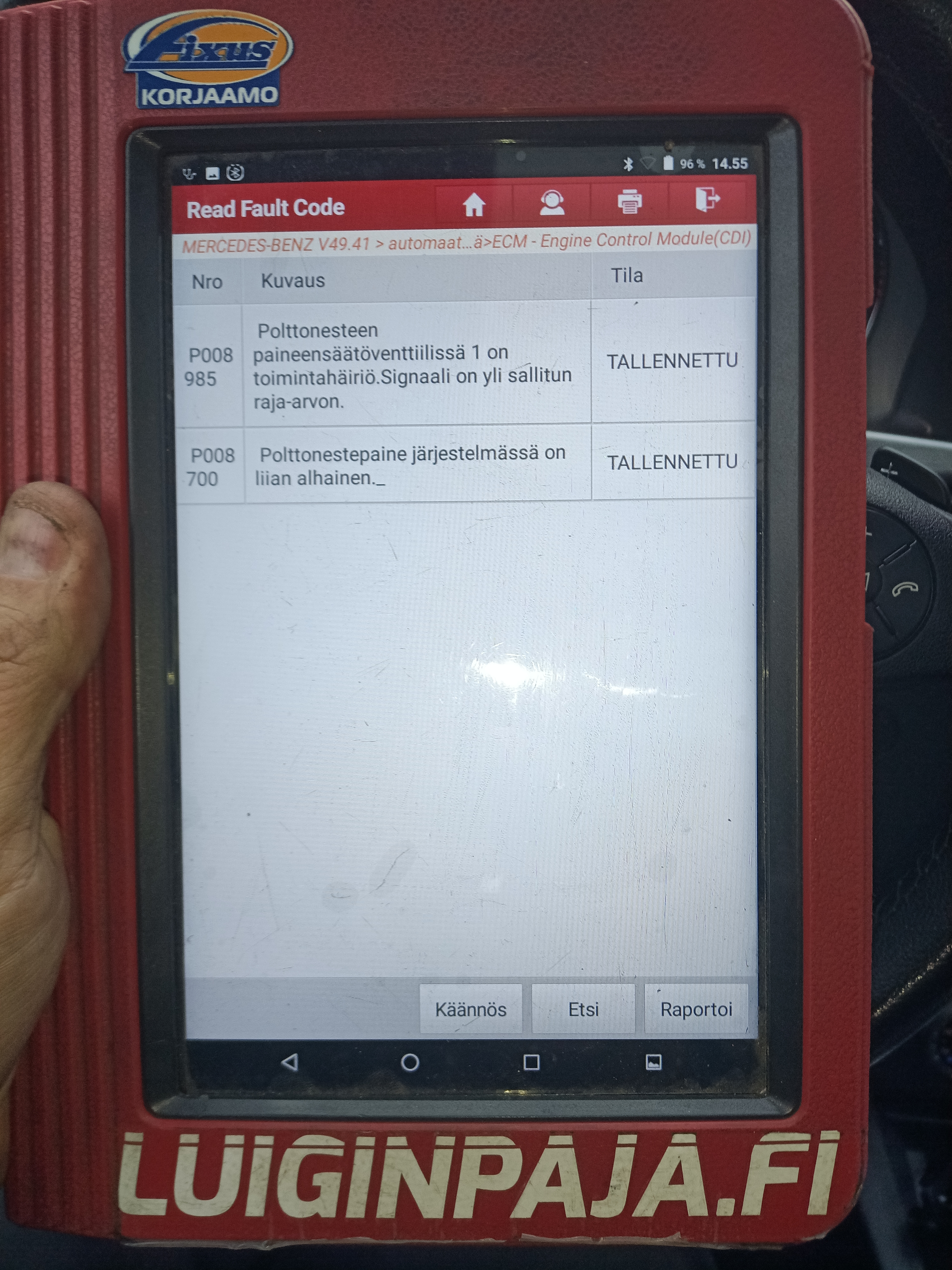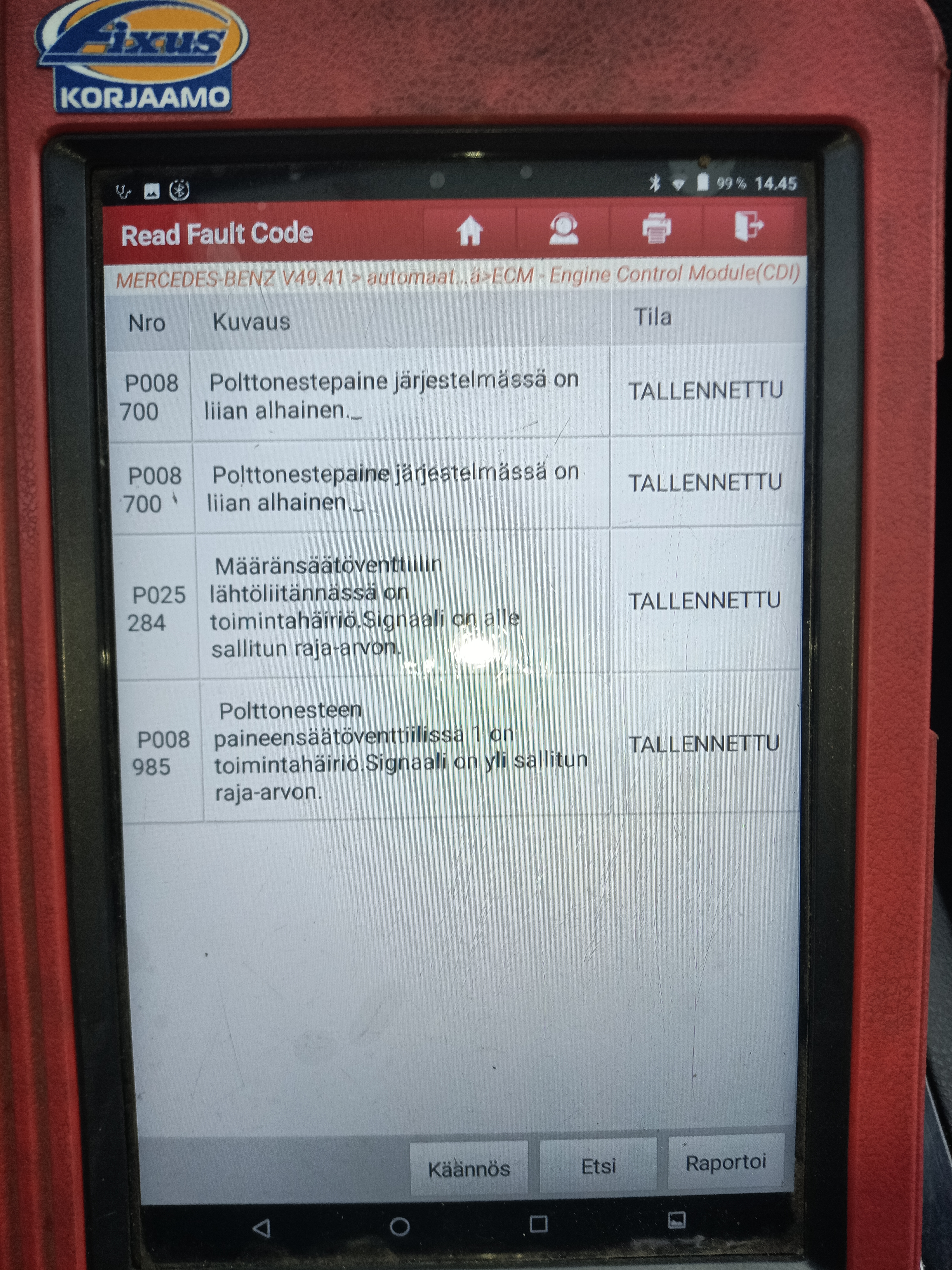 - Moottori menee välittömästi vikatilaan. Autoon on as. tietojen mukaan vaihdettu suuttimia, kuitissa on kuitenkin vain 2kpl kirjattu ylös? Autossa neljän identtisen näköistä, luultavasti Piraattikorjattua suutinta, sillä niistä kaikista on kaiverrettu pois MB:n varaosanumerot? Samoin vaihdettuja osia on ollut mm. siirtopumppu, polttainesuodatin, korkeapainepumpun säätöventtili jne. Mikään vaihdetuista osista ei ole korjannut auton alkuperäistä vaivaa. Onko korjattu vääriä paikkoja, väärillä osilla vai onko kyse jostain muusta, esim. Dieselbakteerista? https://luiginpaja.fi/dieselbakteeri/ Tämä rikkoo uudetkin osat. Suositus varmistaa tankista / suodattimesta polttoainejärjestelmän tila ennen korjausten jatkamista. Myös vikakoodien ja auton käynnistämättömyyden korjaaminen vaatisi paljon lisäselvitystyötä, alkaen suuttimien testauksesta https://luiginpaja.fi/diesel/. Epäilys testaamatta, että ko. piraattisuutimet eivät toimi, tai eivät ainakaan ole pitkäikäisiä, on suositus uusia suuttimet suoraan lisäongelmien ja kulujen välttämiseksi.