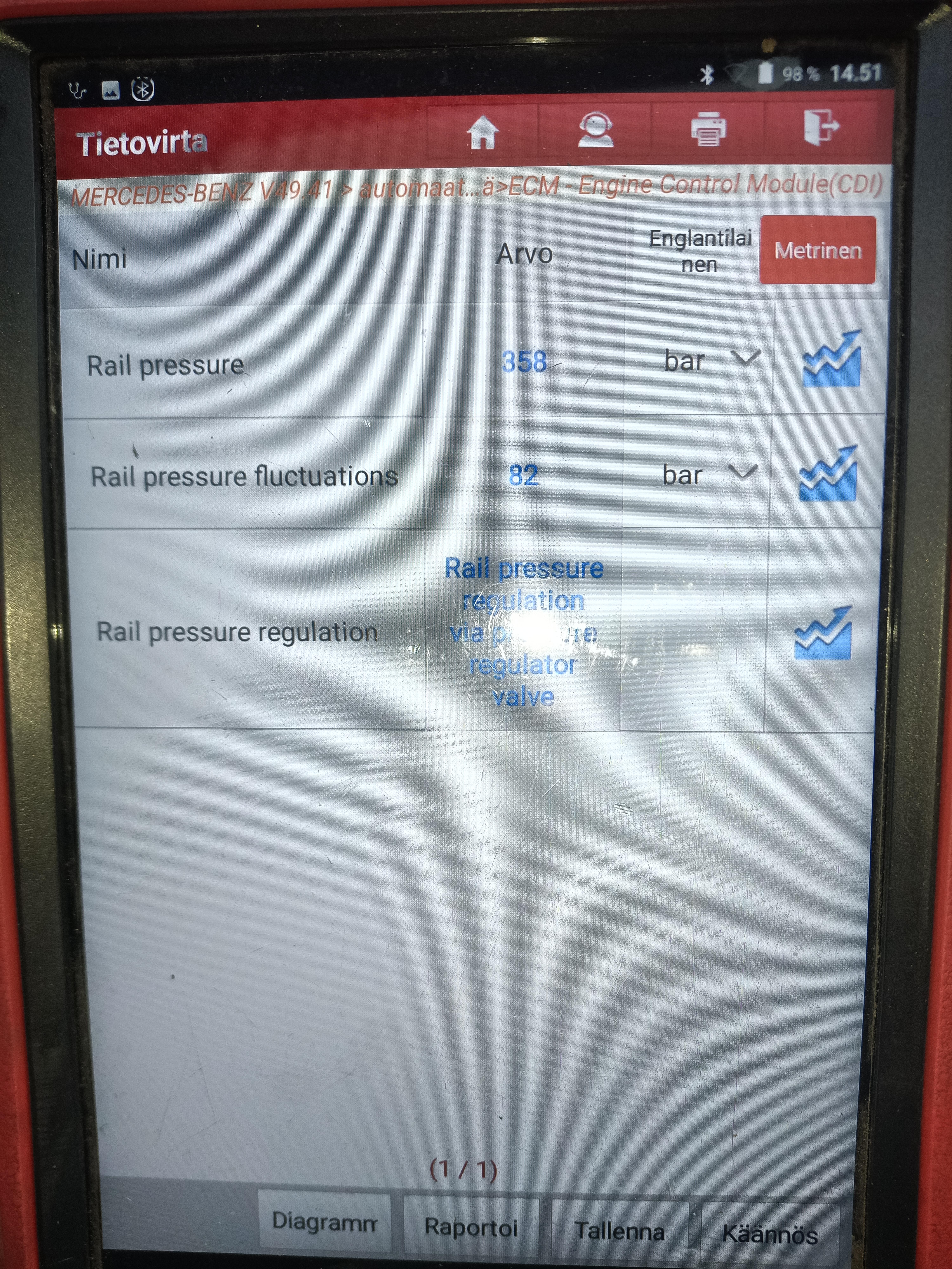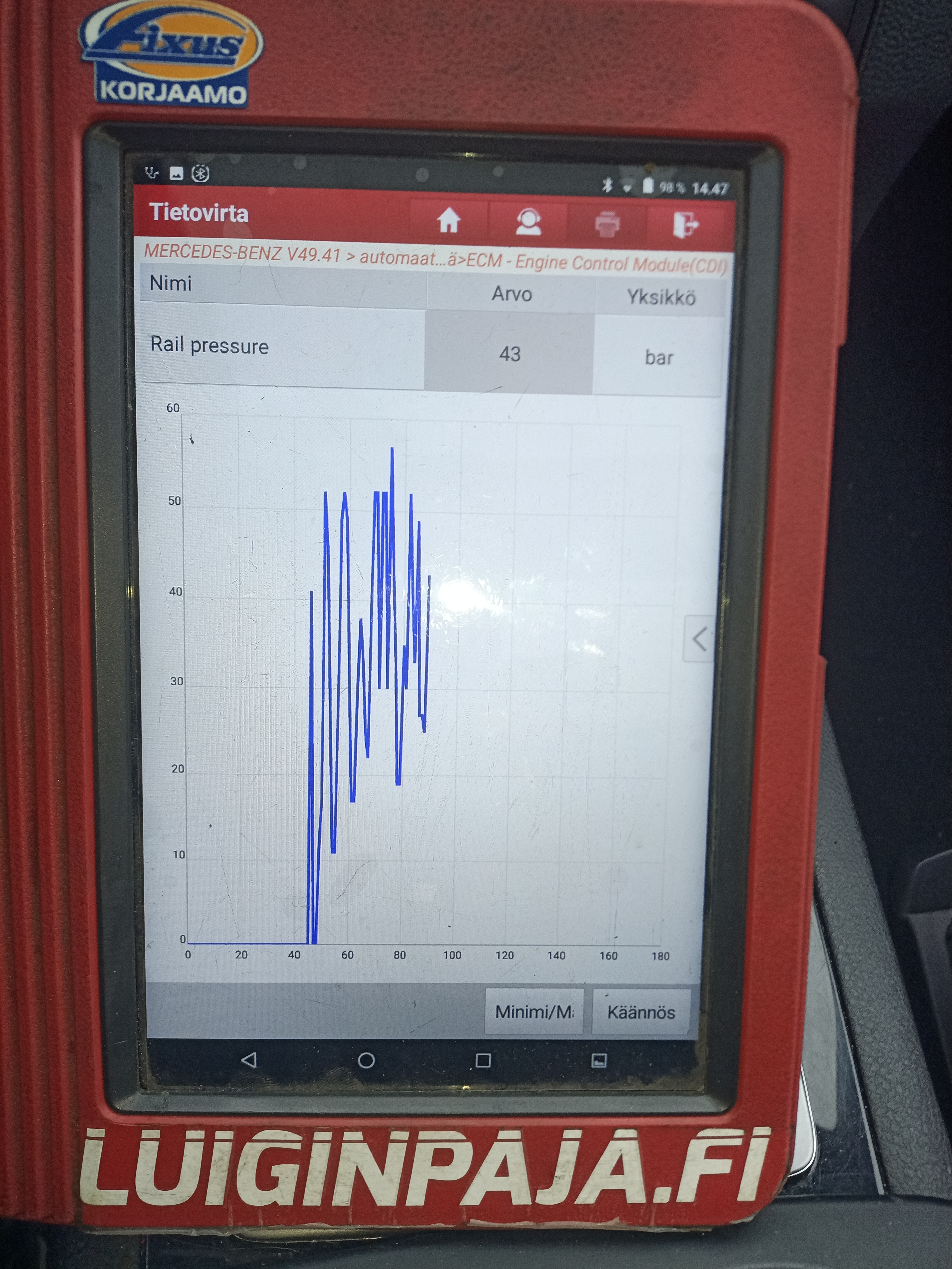 Eli auto menee heti kun vähänkään kiihdyttää vikatilaan. Ja antaa vikakoodia polttonesteen paineensäätöventtilille ja alhaiselle reilipaineelle.