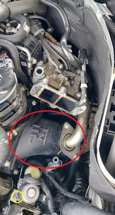 EGR:n jäähdytyksen purkukuvasta näkyvä keltaisella ympäröity pultti: