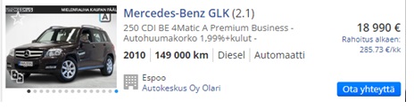XXX-888 on ajomäärällään (alle 200tkm), tehollaan (yli 200hv = 250CDI) alkaen 18k auto, riippuen varusteista yms yms yms. Ollaan tuolla about 20k hintaluokassa. 25.10.2023, katsottu nettiautosta: